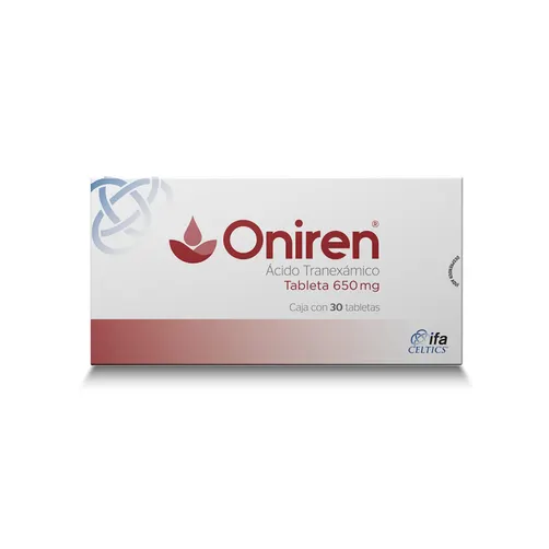Oniren 650 mg tabletas contiene ácido tranexámico, un antifibrinolítico que ayuda a disminuir el sangrado al evitar que se deshagan los coágulos. Se utiliza principalmente para el tratamiento del sangrado menstrual cíclico abundante, bajo supervisión médica. Su uso requiere valorar riesgos de trombosis, interacciones y condiciones como enfermedad renal.